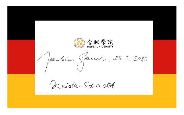 Am 23.03.2016 veranstaltete Bundespräsident Joachim Gauck beim Deutschen Generalkonsulat in Shanghai einen Empfang, an dem auch, auf dessen Einladung, Prof. Dr. Cai Jingmin, Parteisekretär der Universität Hefei, teilnahm.