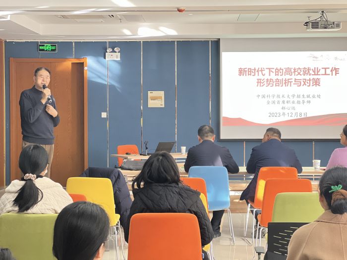 讲座中,郝心远全面分析了目前高校就业现状及深层原因。他结合中科大毕业生就业数据介绍了中科大的整体就业情况,分析了科大学生求职时的地域偏好、行业偏好等。他结合个人从业经历分享了高校就业工作的体会与思考。他表示,要引导学生积极响应国家号召,以学生为中心开展就业服务和指导工作。