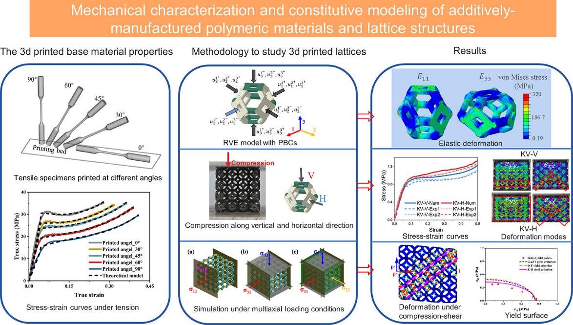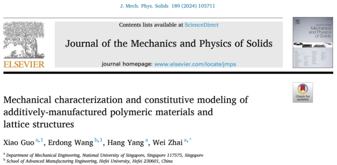 近日,我院机械工程系青年教师王二冬在增材制造聚合物基体材料和晶格结构的力学特性和本构模型方面取得重要进展,相关研究成果以“Mechanical characterization and constitutive modeling of additively-manufactured polymeric materials and lattice structures”为题,在固体力学顶级期刊《Journal of the Mechanics and Physics of Solids》上发表。该论文的共同第一作者为我院教师王二冬和新加坡国立大学郭笑博士,以及共同作者新加坡国立大学杨航博士后,通讯作者为新加坡国立大学翟玮教授。