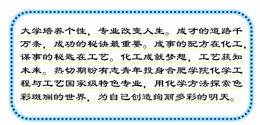 本专业立足安徽区域煤化工、盐化工和石油化工以及衍生材料化工、精细化工、能源化工发展技术新趋势,主动设置与产业链紧密对接专业方向和学科交融,构建了材料化工、节能技术、精细化工和化工分离4个专业方向,形成了专业特色。