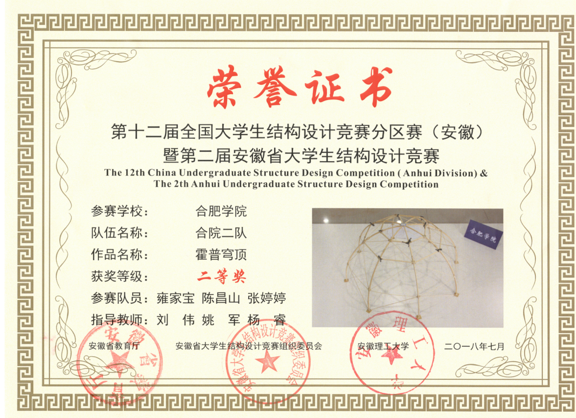 近三年,365官网土木工程专业学生在第十届(第十一届、第十二届)“高教杯”全国大学生先进成图与信息建模大赛中获得3个专项一等奖,2个专项二等奖,6个专项三等奖;第十届(第十一届、第十二届)全国周培源大学生力学竞赛二等奖1项,三等奖6项;第一届(第二届、第三届)安徽大学生结构设计大赛团体2个三等奖,二等奖一项,三等奖一项;安徽省第一届BIM大赛三等奖一项。多次组织“力与美”硬币造型比赛、CAD大赛、周培源力学竞赛选拔赛、测量技能竞赛等竞赛。