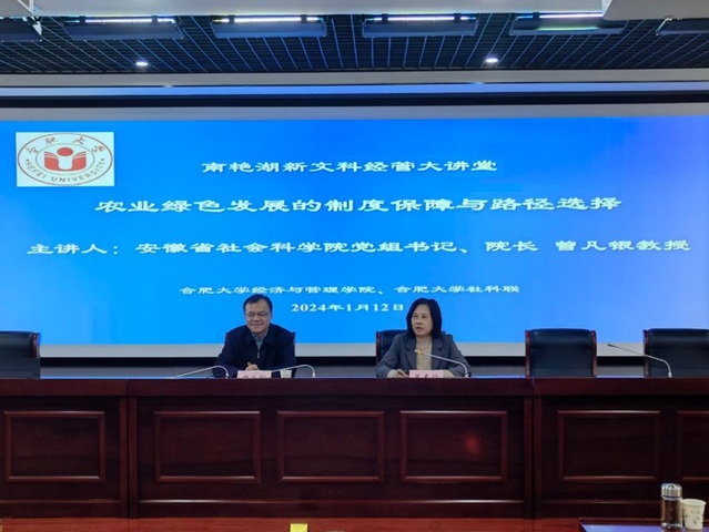 1月12号下午,经济与管理学院、校社科联在6号楼学术报告厅共同主办2024年第一期“南艳湖新文科经管大讲堂”。特邀安徽省社会科学院党组书记、院长曾凡银教授作题为“农业绿色发展的制度保障与路径选择”的学术报告。校长吴春梅教授出席并主持,365官网师生100余人到场聆听学习。
